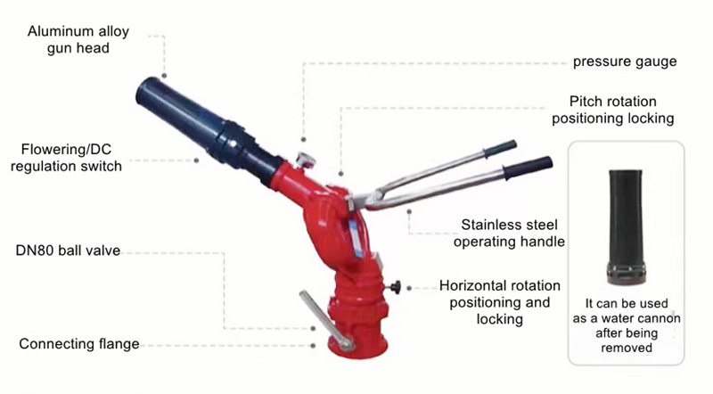 ● Kan water of schuim spuiten; de schuimcilinder kan worden verwijderd om als waterkanon te worden gebruikt, en het heeft ook een bloei- en gelijkstroomfunctie;